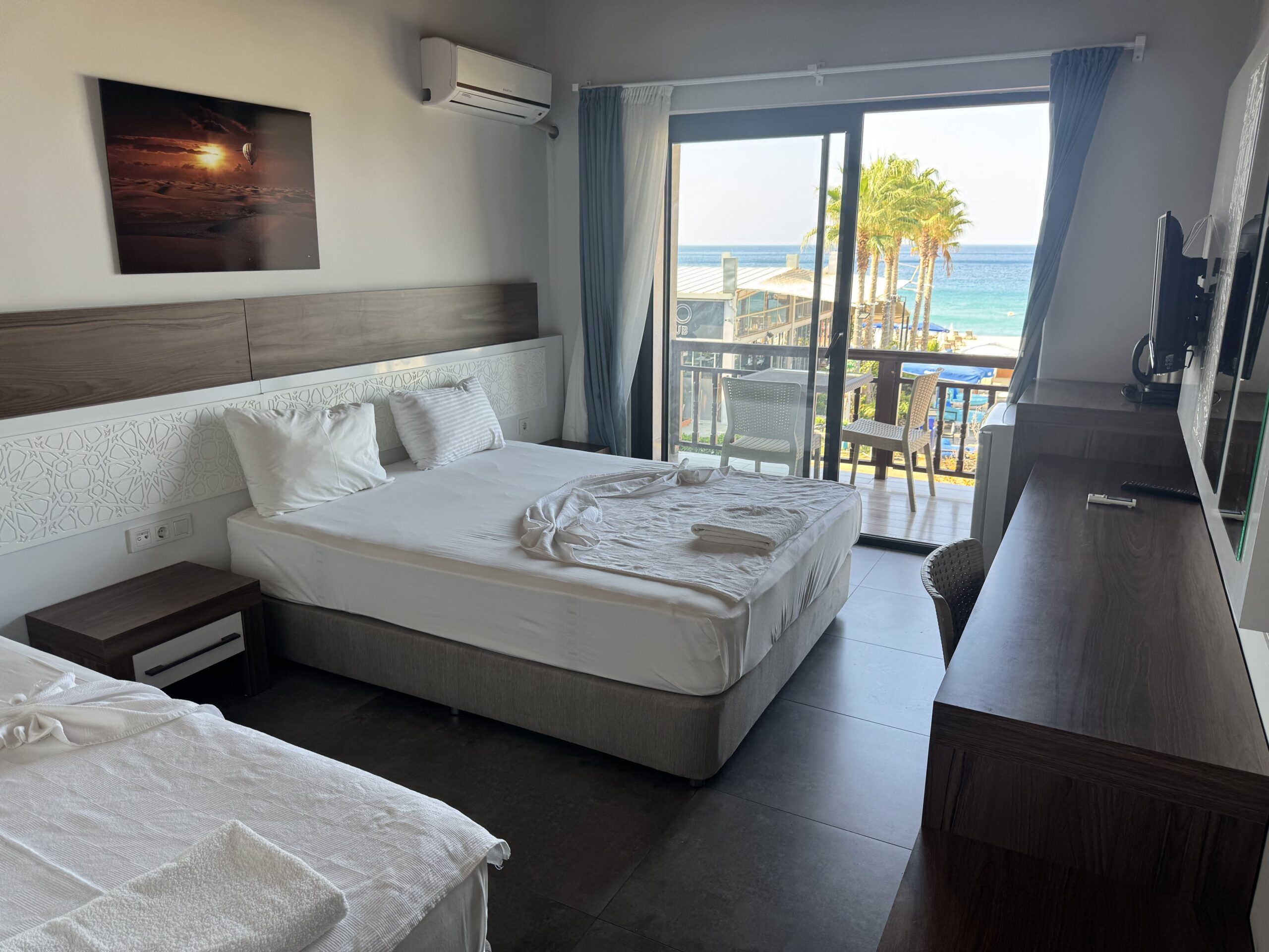 Balkonlu odalar sayesinde uzun konaklamalarda ev konforu yaşatılır.